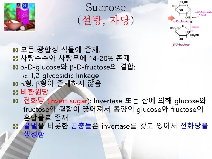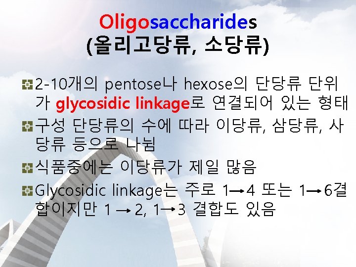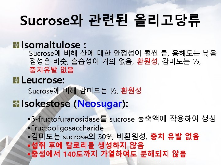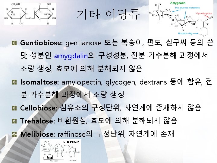 sucrose Raffinose: 비환원성 목화씨, 콩, 사탕무 등에 존재 Gal Stachyose: 비환원성 목화씨, 콩, 사탕무 등에 존재 Gal raffinose Fructose Gentianose: Gentiobiose 비환원성 Maltooligosaccharide: Glucose 2 -6 단위가 α-1 4로 연결 isomaltooligosaccharide α-1 6 결합이 하나 이상 존재하는 maltooligosaccharides