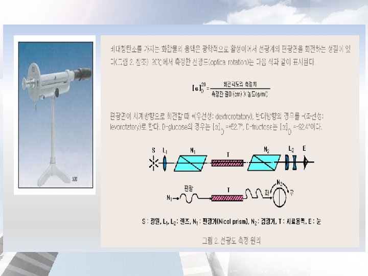 광학적 이성질체(Optical isomer) 광학 이성질체들은 D형/L 형 또는 S형/R형으로 분류 한다 r은 라틴어로 오른쪽인 rectus R형의 S형은 왼쪽이란 뜻의 sinister 우선성: 편광면을 우로 회전시키는 화합물, (d), (+)로 표시 좌선성: 편광면을 좌로 회전시키는 화합물, (l), (-)로 표시 당류의 선광성은 보통 비선광도(specific rotation) In this equation, α (Greek letter "alpha") is the measured rotation in degrees, l is the path length in decimeters, and ρ (Greek letter "rho") is the density of the liquid in g/m. L, for a sample at a temperature T (given in degrees Celsius) and wavelength λ (in nanometers). If the wavelength of the light used is 589 nanometers, the symbol “D” is used. The sign of the rotation (+ or −) is always given.