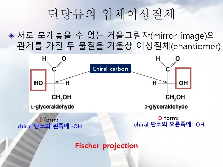 Aldehyde나 ketone group 에서 가장 멀리 떨어진 chiral 탄소에서 –OH의 위치를 확인함. * OH D-glucose * OH D-ribose HO * L-galactose Most naturally occurring carbohydrates are of the D-configuration.