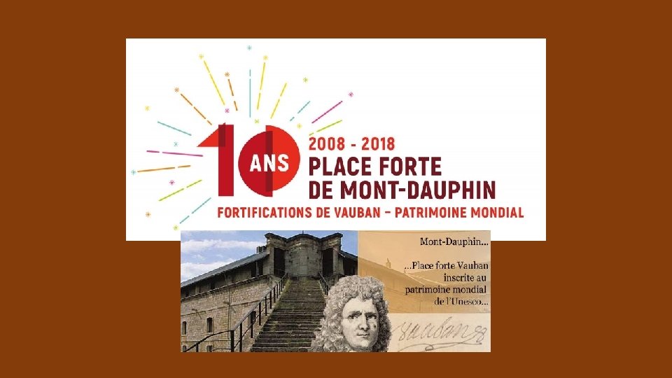 Pour le 10 eme anniversaire de l’inscription du site au Patrimoine de l’Unesco en Juillet 2018 : Exposition art contemporain (Jean-Louis Delbés) Images, archives sur les murs d’enceinte sur le thème des ‘Transports et voies de communication des Hautes Alpes. ’ Jeux avec Pierre, petit tambour, parcours avec énigmes Dans la Librairie boutique : Médaille souvenir spéciale pour l’événement Jeu de l’oie sur le thème de Vauban. Visites commentées de Juin à Septembre à 10 h et 14 h 30. Contact : place-forte-montdauphin. fr ou tel (33) 04. 92. 45. 42. 40