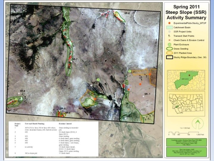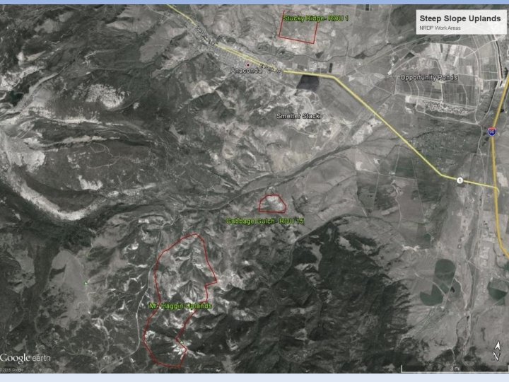 Regulatory Framework • ARCO Remedial Action Work Plan (RAWP) and Final Design Report (FDR) – Stucky Ridge (RDU 1): 2005 – Cabbage Gulch (RDU 15): 2007 • Steep Slope Remediation (SSR) (> 3: 1) – – SSR I (planting, broadcast seeding) SSR II (+ non-mechanized on-slope BMPs) SSR III (+ mechanized on-slope BMPs) SSR IV (+ slope re-grade) • NRDP Restoration Objectives (Sediment, Vegetation) • MT FWP Landowner Objectives (Mt. Haggin Wildlife Management Area) • MT Haggin Technical Working Group