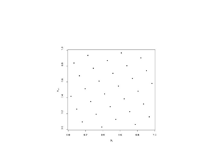 Lineaarne kongruentne generaator Pseudojuhuslikud arvud vahemikus 0. . 1 saadakse valemiga: Lineaarse kongruentse generaatori abil on võimalik saada maksimaalselt m erinevat pseudojuhuslikku arvu: Kui xi = xj (j>i), siis paratamatult xi+1=xj+1 ja järelikult järgnevad pseudojuhuslikud arvud korduvad. Aga xi võimalikud väärtused on 0, 1, . . . , m-1. Kokku m erinevat väärtust. Peale m erineva pseudojuhusliku suuruse genereerimist pole teist võimalust – generaator hakkab samu arve uuesti otsast peale genereerima, sattub tsüklisse. Halb generaator võib aga samu arve kordama asuda ka märksa varem kui m arvu möödudes. . .