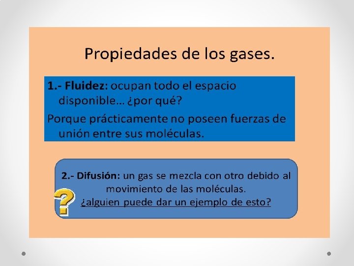 Propiedades de los gases • • 1. 2. 3. 4. El estado gaseoso es un estado disperso de la materia, es decir , que las moléculas del gas están separadas unas de otras por distancias mucho mayores del tamaño del diámetro real de las moléculas. Resuelta entonces, que el volumen ocupado por el gas (V) depende de la presión (P) , la temperatura (T) y de la cantidad o numero de moles ( n). Las propiedades de la materia en estado gaseoso son: Se adaptan a la forma y el volumen del recipiente que los contiene. Un gas, al cambiar de recipiente, se expande o se comprime, de manera que ocupa todo el volumen y toma la forma de su nuevo recipiente. Se dejan comprimir fácilmente. Al existir espacios intermoleculares, las moléculas se pueden acercar unas a otras reduciendo su volumen, cuando aplicamos una presión. Se difunden fácilmente. Al no existir fuerza de atracción intermolecular entre sus partículas, los gases se esparcen en forma espontánea. Se dilatan, la energía cinética promedio de sus moléculas es directamente proporcional a la temperatura aplicada.
