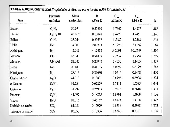 • • • Capacidad calorífica de un gas ideal Para un gas ideal se definen dos capacidades caloríficas molares: a volumen constante (CV), y a presión constante (Cp). CV: es la cantidad de calor que es necesario suministrar a un mol de gas ideal para elevar su temperatura un grado mediante una transformación isócora. Cp: es la cantidad de calor que es necesario suministrar a un mol de gas ideal para elevar su temperatura un grado mediante una transformación isóbara. El valor de ambas capacidades caloríficas puede determinarse con ayuda de la teoría cinética de los gases ideales. Los valores respectivos para gases monoatómicos y diatómicos se encuentran en la siguiente tabla: R es la constante universal de los gases ideales, R = 8. 31 J/mol K.
