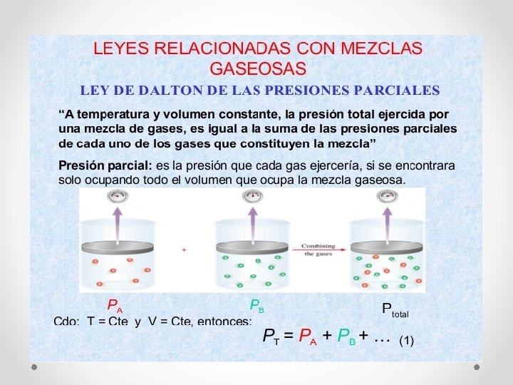 Ley de Dalton de las presiones parciales. • La presión parcial del componente de una mezcla de gases se define como la presión que ejercería el gas componente , si ocupara solo el volumen completo. Entonces , • la presión total de • la mezcla de • gases ideales , es • la suma de las • presiones • parciales de los • gases que la • componen.