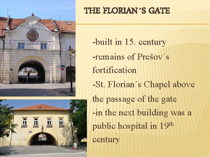 THE FLORIAN´S GATE -built in 15. century -remains of Prešov´s fortification -St. Florian´s Chapel above the passage of the gate -in the next building was a public hospital in 19 th century