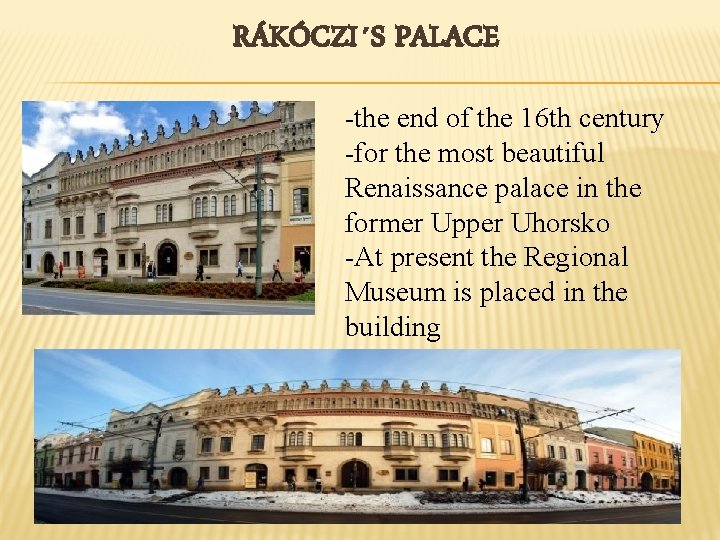 RÁKÓCZI´S PALACE -the end of the 16 th century -for the most beautiful Renaissance palace in the former Upper Uhorsko -At present the Regional Museum is placed in the building