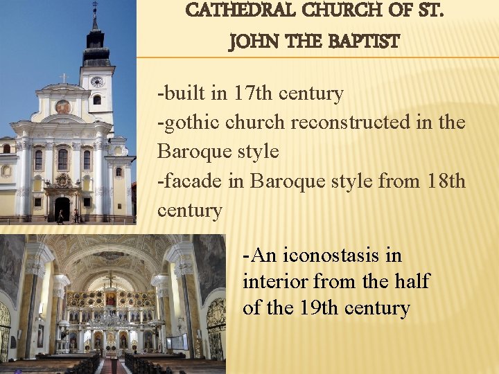 CATHEDRAL CHURCH OF ST. JOHN THE BAPTIST -built in 17 th century -gothic church reconstructed in the Baroque style -facade in Baroque style from 18 th century -An iconostasis in interior from the half of the 19 th century