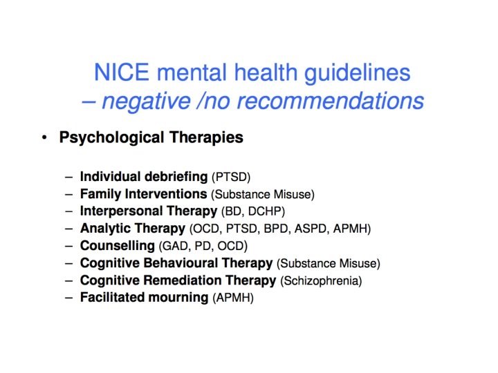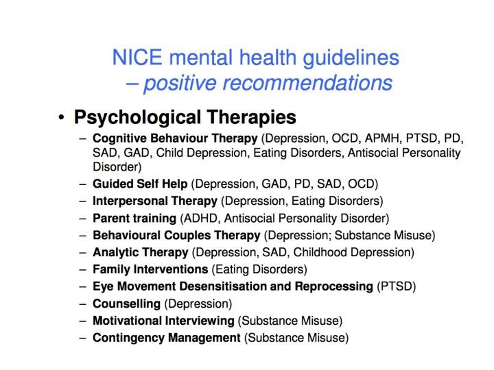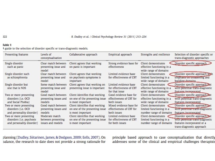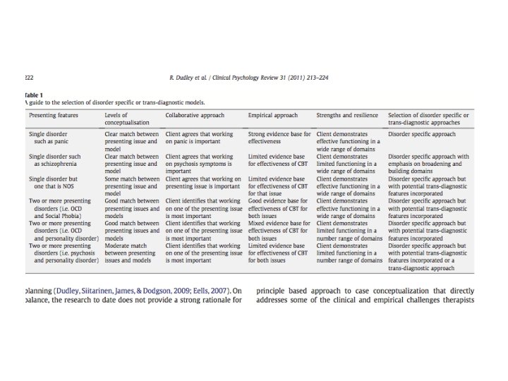 Disorder-specific vs. transdiagnostic • Kuyken et al (2009); Dudley et al (2011) • Different levels of empirical evidence for different disorders (strong for anxiety) • Evidence for transdiagnostic processes not treatments (but Mc. Manus et al, 2014) • Client strengths and resilience • Disorder-specific where evidence exists and possible