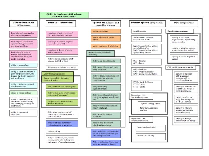 CBT competencies • • • Roth & Pilling (2007) Generic therapeutic competencies Basic CBT competencies Specific behavioural and cognitive therapy Problem specific competencies Metacompetencies – Generic – CBT specific • www. ucl. ac. uk/CORE/ – Interactive map – Written materials