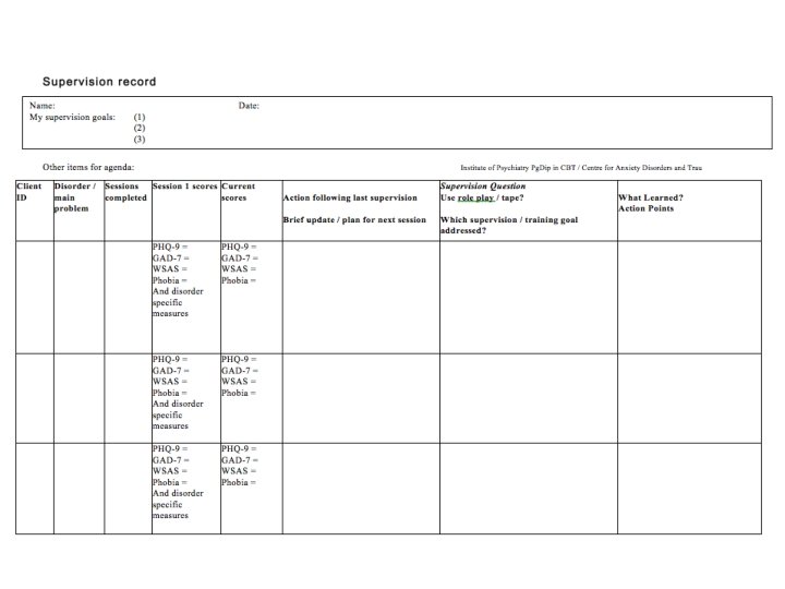Making the most of supervision • Supervision isn’t the time to start thinking about a case • Do the thinking before supervision • Supervision questions • Tapes at right place • Formulation / questionnaires available • Supervision record / plan