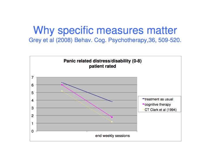How can we know? • We need to get evidence of what is actually happening. • Is therapist report good enough evidence? • Audio and / or video recordings – For patients – For supervision – For reliability checks and ensuring quality.