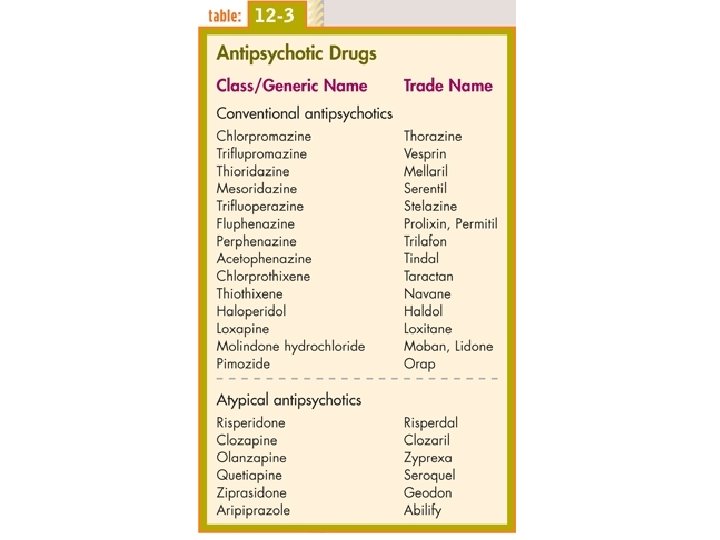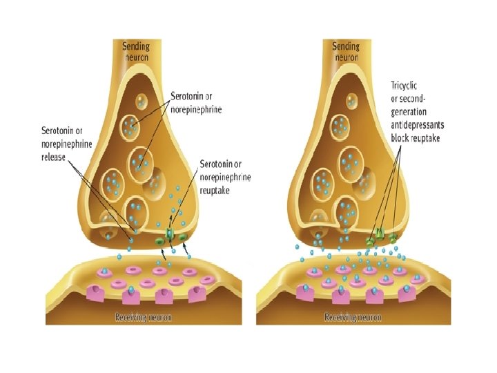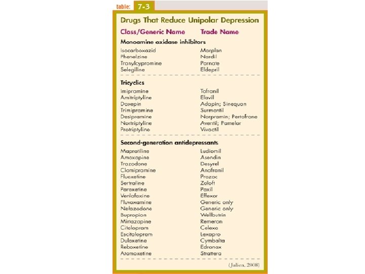 Antidepressants • Tricyclic antidepressants – Imipramine (Tofranil), Desipramine (Norpramin), Amitriptyline (Elavil) • Monoamine Oxidase Inhibitors (MAOIs) – Phenelzine (Nardil), Tranylcypromine (Parnate) • Selective Serotonin Reuptake Inhibitors (SSRIs) – Fluoxetine (Prozac), Sertraline (Zoloft), Paroxetine (Paxil), Fluvoxamine (Luvox)