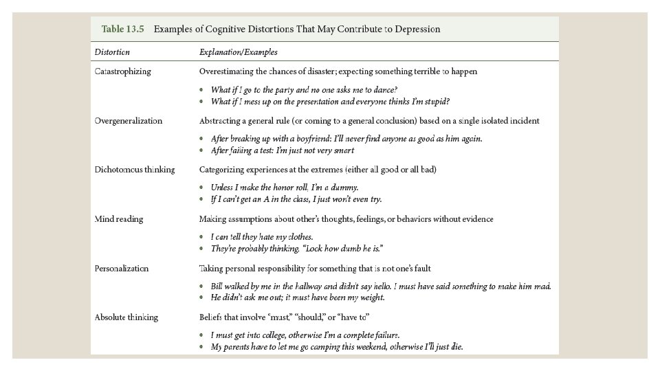 Treatment ◦ Adults: ◦ Evidence-based psychotherapy ◦ Behavioral/Cognitive behavioral therapy ◦ Interpersonal psychotherapy ◦ Medication: ◦ Antidepressants including SSRIs, tricyclic antidepressants, and monoamine oxidase inhibitors