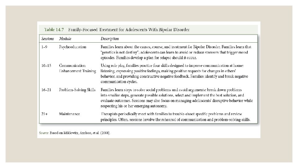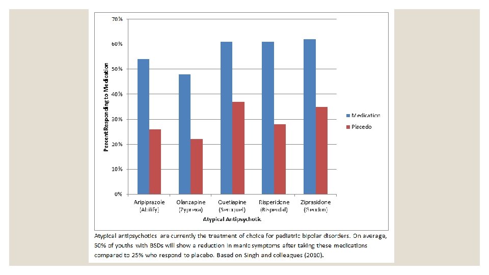 Therapeutic Interventions ◦ Medication ◦ Lithium ◦ Anticonvulsants- Depakote, Tegretol ◦ Atypical antipsychotics- Zyprexa, Risperdal ◦ Side effects common, some serious & long-term (e. g. kidney and heart problems) ◦ Hospitalization