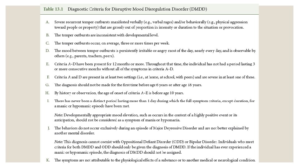 Disruptive Mood Dysregulation Disorder ◦ New to the DSM-5 ◦ Basically a diagnostic category for children who demonstrate periods of extreme irritability and emotional outbursts when the symptoms are not episodic. ◦ This diagnosis was based on longitudinal research. The studies tracked children originally diagnosed with bipolar disorder. Most children who demonstrated extreme irritability and emotional outbursts which are not episodic no longer meet criteria for bipolar disorder later in life.