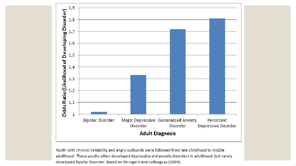 Mania in children & adolescents ◦ Frequent mood shifts, mixed moods, chronic difficulty regulating mood (episodes less distinct) ◦ Irritability (less euphoria) ◦ Psychotic features more likely ◦ Distinct disorder? ◦ Severe mood dysregulation ◦ Extreme ADHD