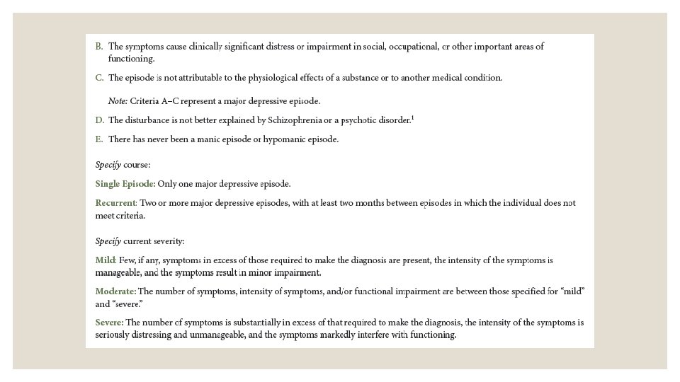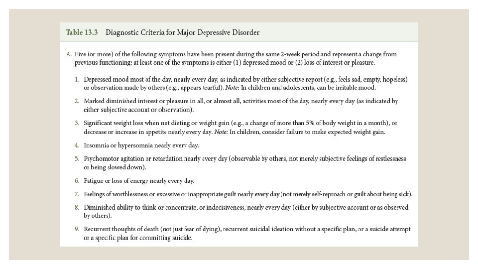 Major Depressive Disorder ◦ Core Features (diagnosis requires at least 1 of the following): ◦ Depressed, sad, or irritable mood ◦ Loss of interest in most activities (anhedonia) ◦ As with adults 5 of 9 DSM-5 symptoms needed (see DSM-5 criteria next slide)