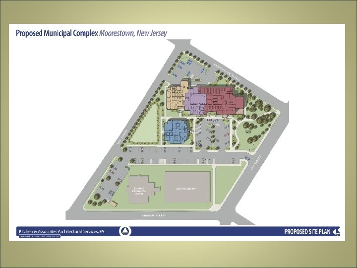 MOORESTOWNSHIP MUNICIPAL COMPLEX • Project Status – Building #1 & Building #2 Out for Bids • OSC Review and Approval for Advertisement – Project Labor Agreement [PLA] has been negotiated – Additional Testing of Underground Storage Tanks [UST] complete – remediation plan formulating – DEP Review of Remediation – in Progress – Police Relocation Complete