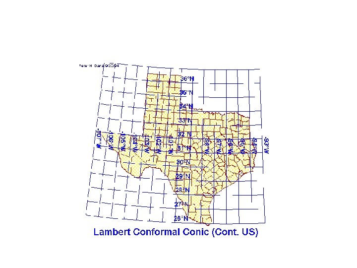 Cambios de sistema de coordenadas • Moraleja: – Todas las capas (“layers”) de información geográfica de un banco de datos de “GIS” deben estar en el mismo sistema de referencia. – “el mismo sistema de referencia” = tipo de proyección + Datum.
