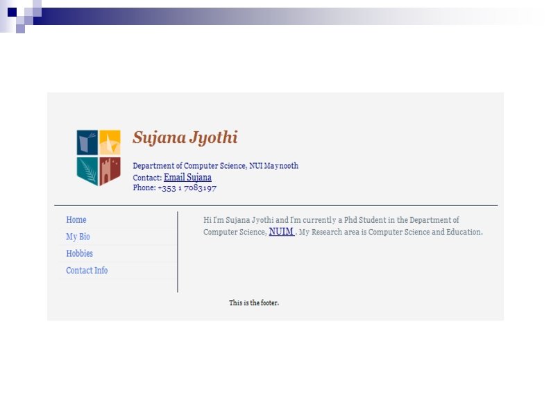In HTML <div id="header"> <img src="i/nuim_crest. gif">. . . </div> <div id="content"> Hi I'm. . . </div> <div id="lefty"> <div id="menu"> <ol><li>Home</li>. . </ol> </div> Holography. . </div> <div id="footer"> Home. . . </div> End User Computing