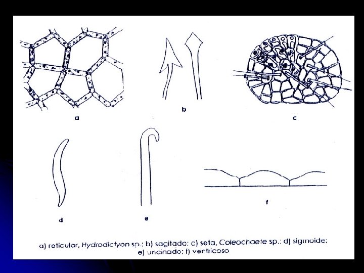 Recubrimiento del talo: Mucilaginoso: substancias pegajosas, viscosa, gomosa, gelatinosa. Calcarea: carbonato de calcio (calcita o aragonita)