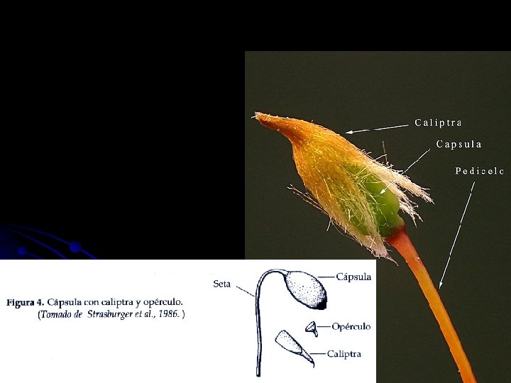 Talo acintado, laminar de Symphyogyna. El esporfofito comienza a emerger a través de una caliptra tubulosa.