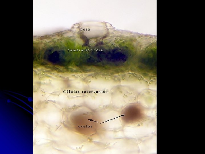 Observe las células clorofilianas, alargadas y las células reservantes de agua (transparentes) con sus poros.