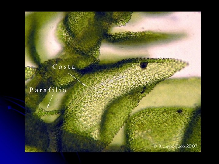 Las células de la costa tienen paredes engrosadas. Observe el detalle de las laminillas con hileras de células con cloroplastos.