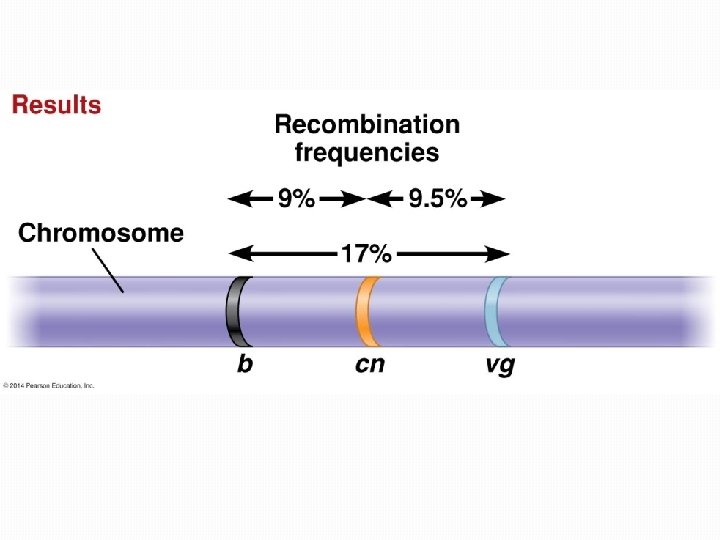 Recombination Frequencies �Genes that are adjacent have a recombination frequency near 0%, �Genes that are very far apart on a chromosome have a recombination frequency of 50%, �The relative distance between linked genes influences the amount of recombination observed.