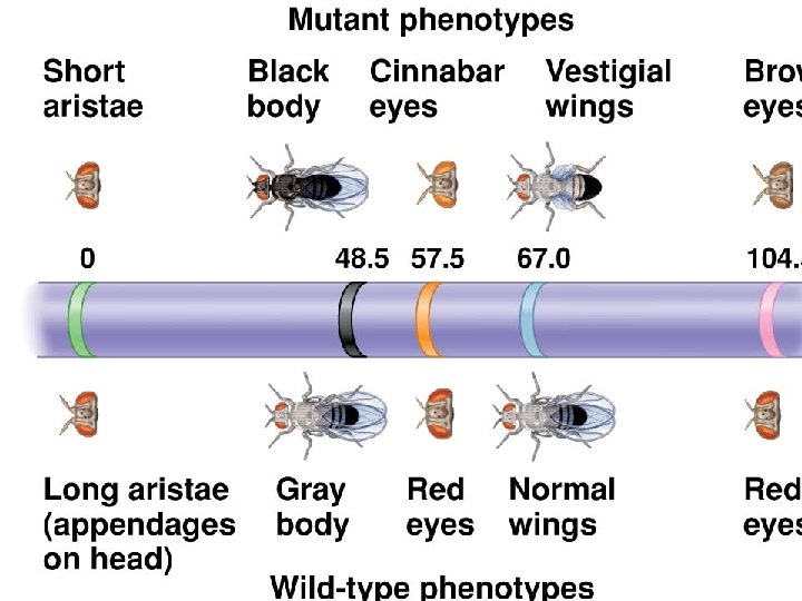 Linked Genes �Genes located near each other tend to be inherited together �Ex. Wing presence and body color of flies �Genetic recombination- production of offspring with combinations of traits different than parents �Parental type �Recombinant types (recombinants)