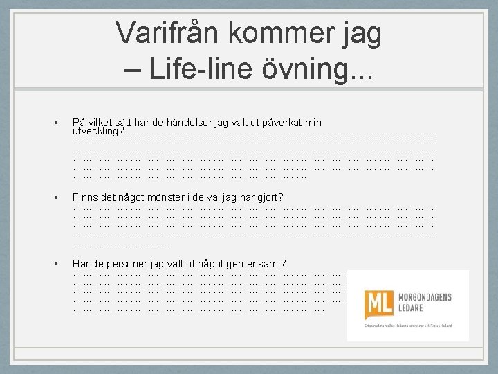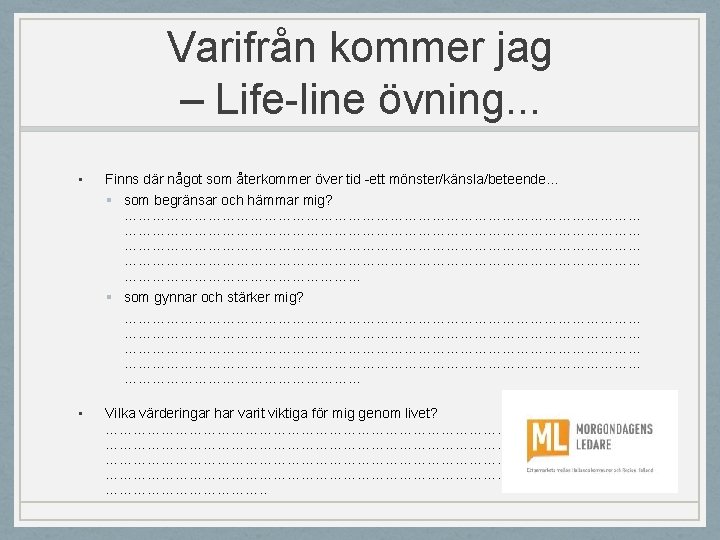 Life-Line Pedagogiken och processen “Självstyrt lärande” tar sin start i att utforska och analysera sina egenskaper och behov. Den första frågan att besvara är: “Var har jag varit och hur kom jag hit? ” Följande övning handlar om att se tillbaka på ditt liv och reflektera kring vad som har gjort dig till den du är.