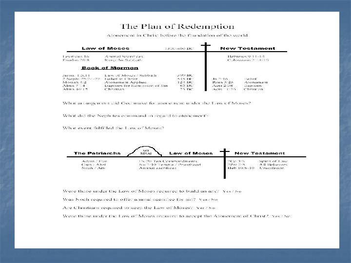 Study #3 The Plan of Redemption Atonement in Christ before the foundation of the world Law of Moses 1500 -400 BC New Testament after AD 30 Leviticus 16 Exodus 20: 8 Animal Sacrifices Keep the Sabbath Hebrews 9: 11 -14 When Christ came Colossians 2: 14 -16 Canceled the written code John 3: 16 Belief in Christ Romans 3: 25 Atonement in Christ Acts 2: 38 Baptism into Christ Acts 11: 26 Becoming a Christian Book of Mormon Jarom 1: 5, 11 2 Nephi 25: 24 -27 Mosiah 4: 2 Alma 7: 14 Alma 46: 15 Law of Moses / Sabbath Belief in Christ Atonement Applied Baptism for Remission of Sin Christian 399 BC 545 BC 124 BC 83 BC 73 BC
