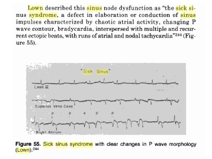 SSS Patients with symptomatic SSS are primarily older, with frequent co morbid diseases and a high mortality rate. In three major trials of pacing in this disorder, the median or mean age was 73 to 76 years. Ventricular pacing or dual-chamber pacing for sinus-node dysfunction. Lamas GA; Lee KL; Sweeney MO; Silverman R; Leon A; Yee R; Marinchak RA; Flaker G; Schron E; Orav EJ; Hellkamp AS; Greer S; Mc. Anulty J; Ellenbogen K; Ehlert F; Freedman RA; Estes NA 3 rd; Greenspon A; Goldman. N Engl J Med 2002 Jun 13; 346(24): 1854 -62. • Chronic, inappropriate, and often severe bradycardia • Sinus pauses, arrest, and exit block with and often without, appropriate atrial and junctional escape rhythms. • AV conduction disturbances in over 50 percent of patients • Alternating bradycardia and atrial tachyarrhythmias in over 50 percent of cases. AF is most common, but atrial flutter and paroxysmal supraventricular tachycardias may also occur.