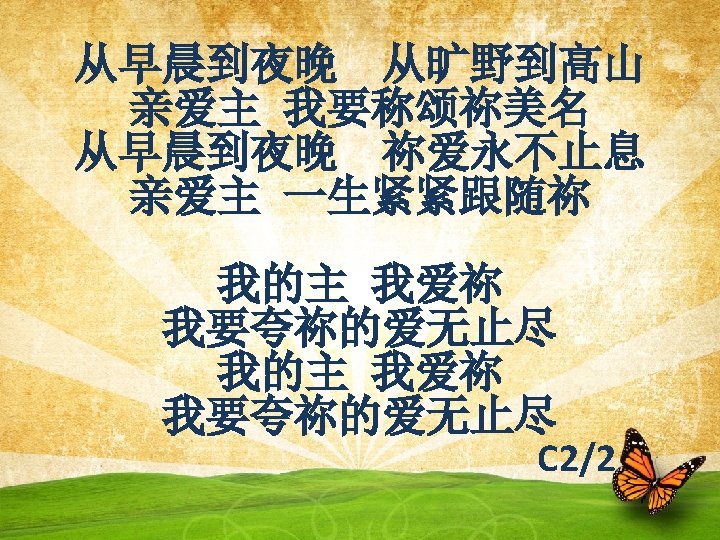 从早晨到夜晚 从旷野到高山 From the morning through the night From the valley to the heights 亲爱主 我要称颂祢美名 Forever, I will lift Your name on high 从早晨到夜晚 祢爱永不止息 From the morning through the night Your love for me carries on 亲爱主 一生紧紧跟随祢 Forever, I will follow after You C 3/4