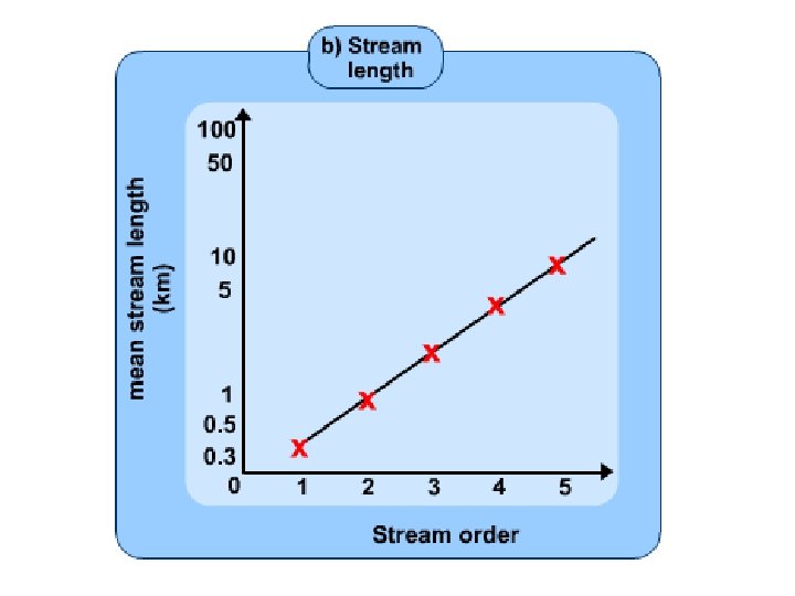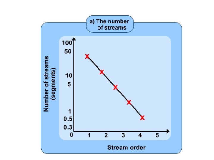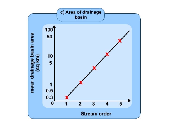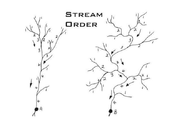 • Although the number system given here, and nowadays in common use, differs from Horton’s original in the treatment of trunk streams, Horton’s laws of drainage composition still hold, namely: – Law of stream numbers: the numbers of streams of different orders in a given drainage basin tend closely to approximate an inverse geometric series in which the first term is unity and the ratio is the bifurcation ratio. – Law of stream lengths: the average lengths of streams of each of the different orders in a drainage basin tend closely to approximate a direct geometric series in which the first term is the average length of streams of the first order. – Low of drainage area