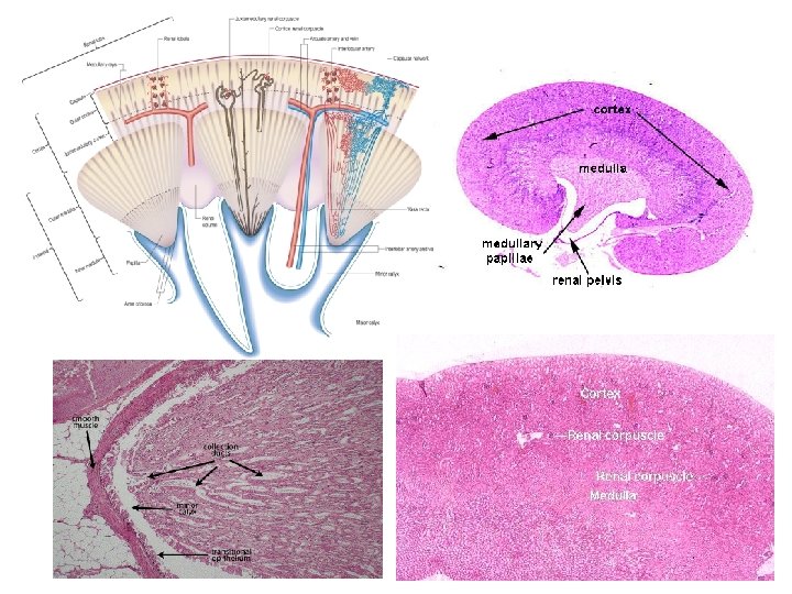 Minor Calyx, Major Calix and Pelvis Renalis Umbrella cell Pear shaped cell Structure: Tunica mucosa 1. Epithelium mucosae: urothelium (transitional epithelium) 2. Lamina propria: loose connective tissue with blood vessels No lamina muscularis mucosae and tela submucosa!!! Tunica muscularis (peristalsis) Inner longitudinal Outer circular Tunica adventitia Loose connective tissue with blood and lymph vessels and nerves connected to the adipose tissue of the renal sinus (interlobar arteries, veins)