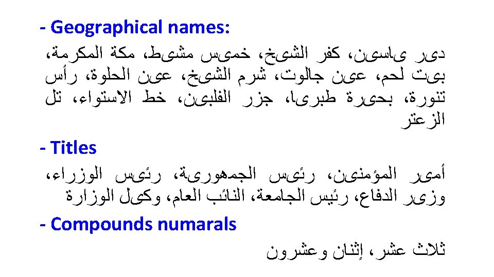 Compounding in Arabic • Arabic compounds consist of lexical items separated by a blank. 1. Compound Nouns: Noun + apposited noun: Proper nouns: ﺷﺠﺮﺓ ، ﺍﻣﺮﺅ ﺍﻟﻘیﺲ ، ﺍﻡ ﻛﻠﺜﻮﻡ ، ﻣﺤﻲ ﺍﻟﺪیﻦ ، ﻋﺒﺪ ﺍﻟﻠﻪ ﺍﻟﺪﺭ