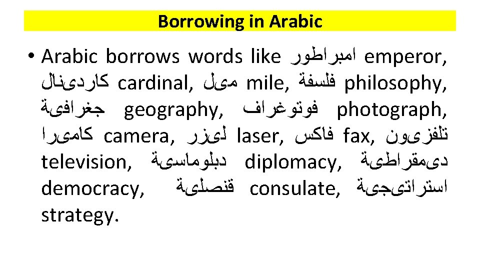 Coinage in Arabic • Coinage can take place in Arabic either through borrowing or derivation. • Examples of borrowing: ﻧﻴﺪﻭ ، ﺑﺎﻣﺒﺮﺯ • Examples of derivation: ﻣﻄﺒﻌﺔ ، ﻣﻮﻗﻒ ، ﻣﻄﺎﺭ