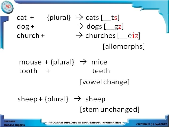 Morphs and Allomorphs [a book an egg] 1. cats bags 2. liked grabbed wanted churches