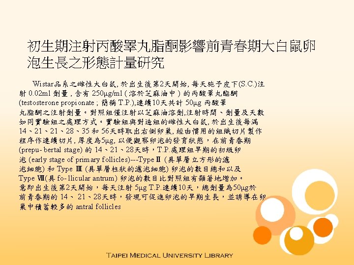 Morphometric studies of neonatal treatment with testosterone propionate on follicular growth in prepubertal rats n Female albino rats of an inbred Wistar strain had been daily given a subcutaneous injections either 0. 02 ml vehicle only, or 5 μg testosterone propionate (T. P. ) in the same volume of sesame oil on the next day after birth, and then continued this process for 10 days long. Total dose of T. P. received by each T. P. -treated group was 50 μg. All right ovaries were removed at 14、21、28、 35、56 days after birth. Growth of ovarian follicles was examined with their serial sections made by the routine histological tech- niques. In T. P. -treated groups, either the sum of numbers of TypeⅡ follicles (growing oocyte surrounded by single layer of cuboid -shaped follicular cells) and Type Ⅲ follicles (growing oocyte surrounding by single layer of column-shaped follicular cells) or the sum of numbers of Type Ⅶ follicles (antral follicles) were more than those of the control(sesame oil-treated) groups at pre- pubertal stage (e. g. , 14、21 or 28 days after birth). From these points of views, the author finds meaningfully in any prepubertal group of T. P. -treated rats, the total dose of T. P. 50 μg, given neonatally for 10 -day period, has been proved to stimulate signi- ficantly the growth of the early stage of primary follicles and preserves more numbers of the antral follicles in ovaries of the prepubertal female rats.
