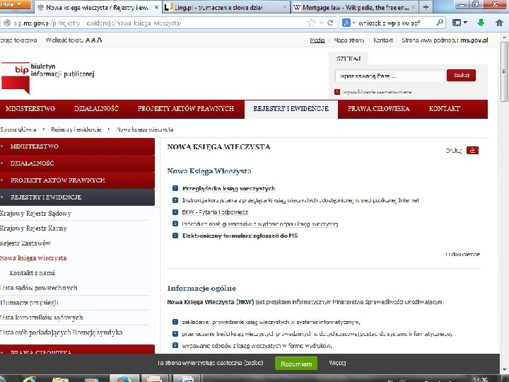 Land register book – morgages register �www. ms. gov. pl �Number: WR 1 O/00024757/9 �Division I - basic information of the land – area of plots, map data, �Division II - owner’s name, information of possible premises separated from the eventual building �Division III – various informations ( third persons rights – easments, third person’s claims securties) �Division IV – mortgages.
