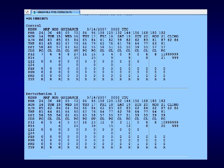 Ensemble MOS forecasts are based on ensemble runs of the GFS model included in the 0000 UTC ensemble suite each day. These runs include the. operational GFS, a control version of the GFS (run at lower resolution), and 10 pairs (positive and negative) of bred perturbation runs (20 members). The operational GFS MOS prediction equations are applied to the output from each of the ensemble runs to produce separate bulletins in the same format as the operational message.