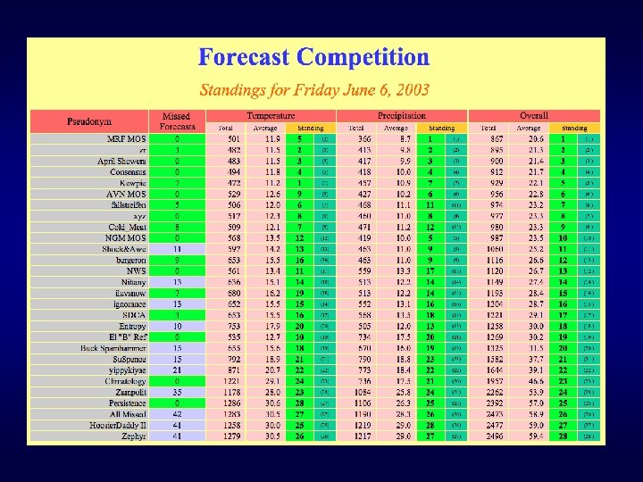 Some Questions • How does the current MOS performance…driven by far superior models… compare with NWS forecasters around the country. • How skillful is a composite MOS, particularly if one weights the members by past performance? • How does relative human/MOS performance vary by forecast projection, region, large one-day variation, or when conditions vary greatly from climatology? • Considering the results, what should be the role of human forecasters?
