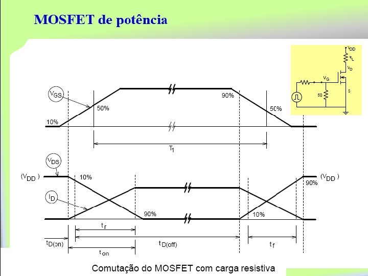 Valores típicos para um MOSFET de 400 V e 4 A: td(on) = 30 ns ; tr(on) = 50 ns ; td(off) = 10 ns ; tf = 50 ns ØOs tempos fornecidos pelos fabricantes referem-se normalmente a cargas resistivas e a grandeza de referencia é sempre a tensão. Os tempos de comutação dependem muito do circuito de comando de gatilho empregado.