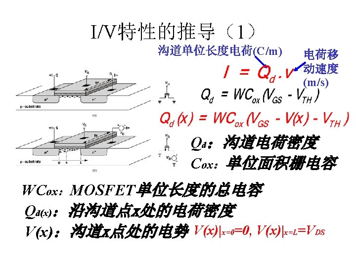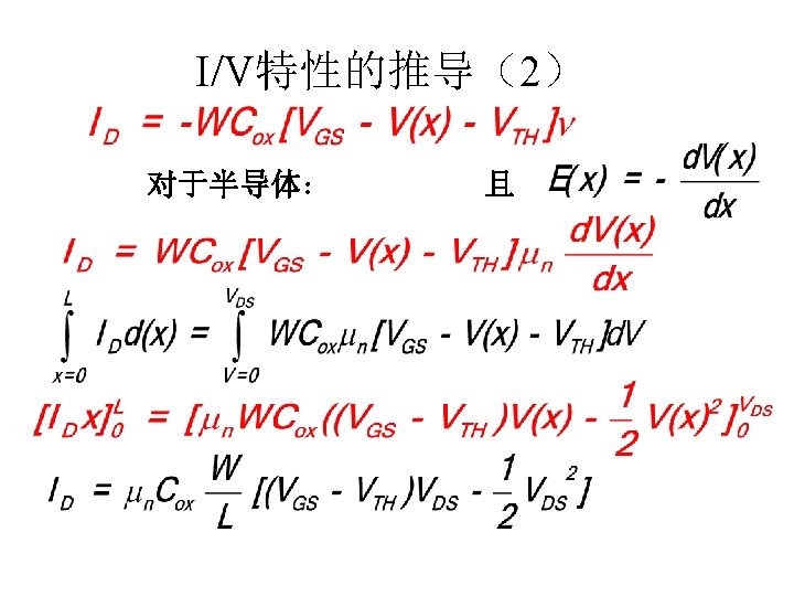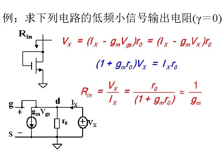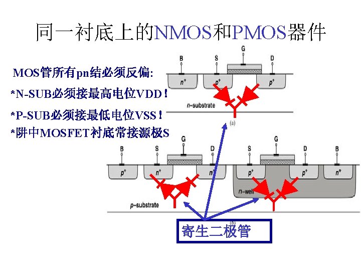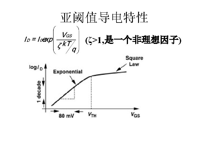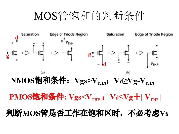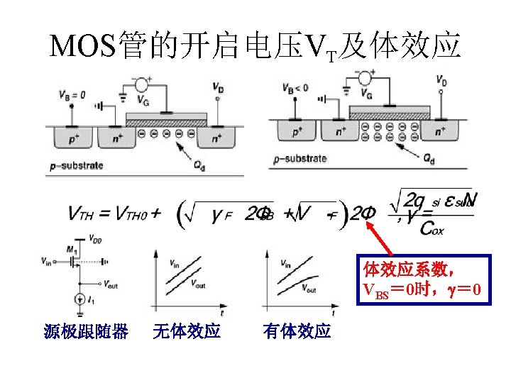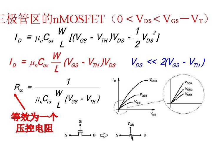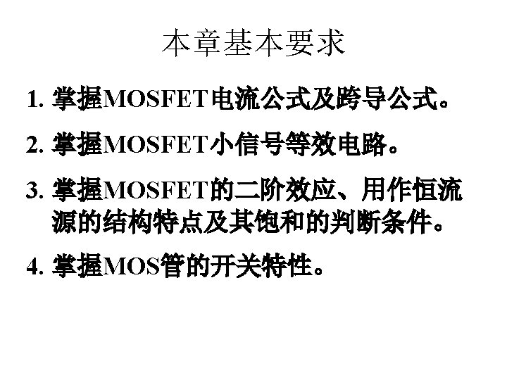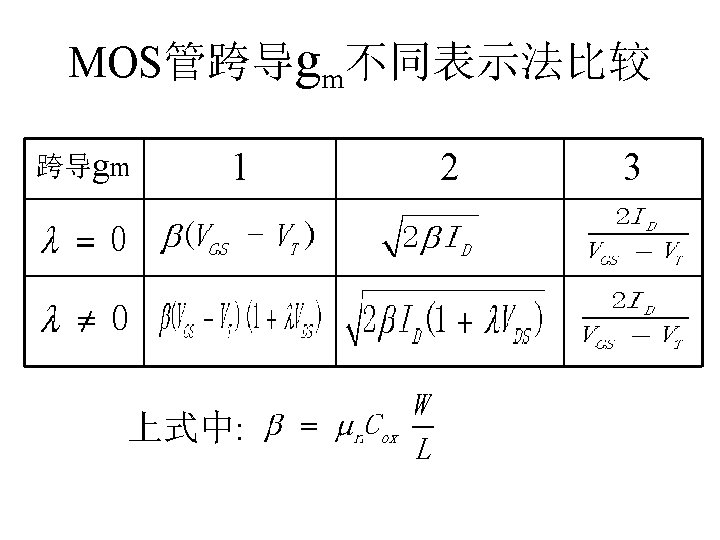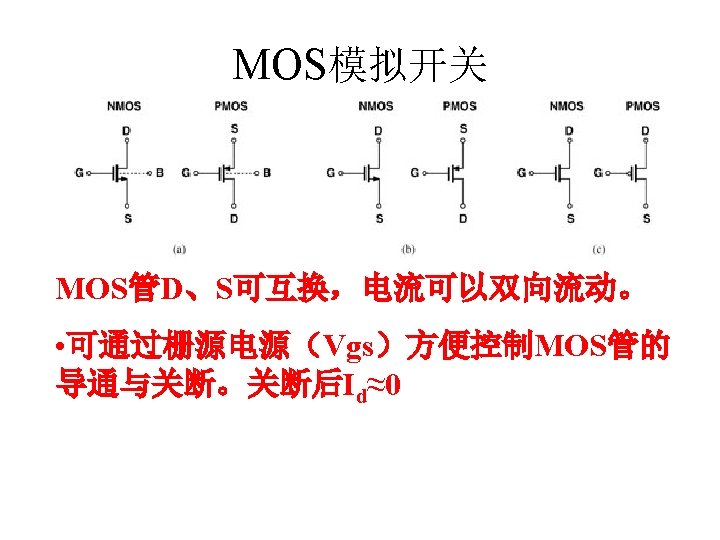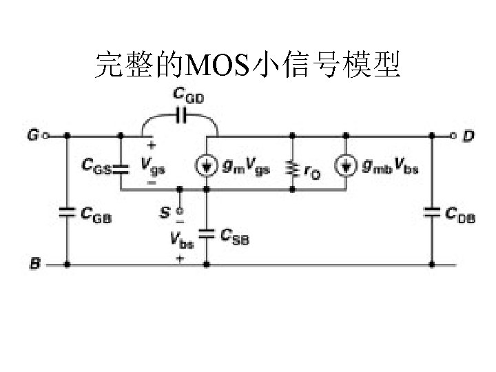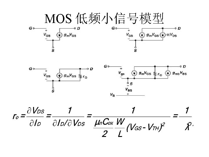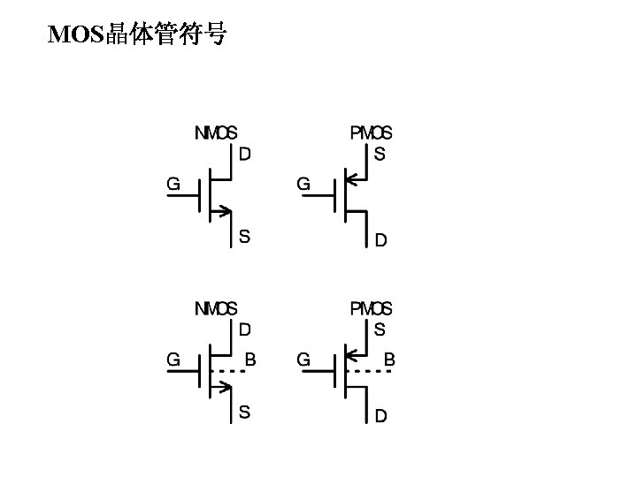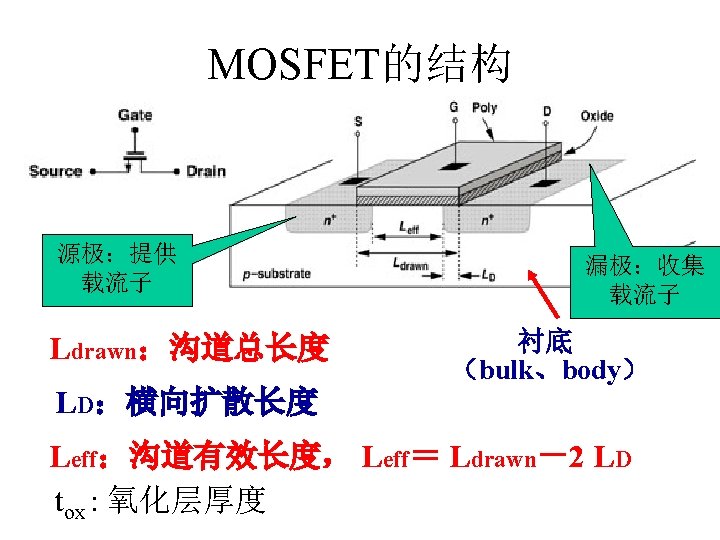 MOSFET MOSFET MetalOxide Semiconductor FieldEffect Transistor CMOS MOS Slides: 63 Download presentation MOSFET的结构 MOSFET : Metal-Oxide Semiconductor Field-Effect Transistor CMOS : 互补MOS n型MOSFET :载流子为电子 p型MOSFET :载流子为空穴 阱: 局部 衬底 VGS>VT、VDS=0 VGS>VT、VDS>VGS-VT称为饱和区 NMOS管的电流公式 截至区,Vgs<VTH 线性区, Vgs >VTH VDS< Vgs - VTH 饱和区, Vgs >VTH VDS >Vgs - VTH MOSFET的跨导gm 2) VGS > VTH VDS <<VGS – VTH深三极管区 3) VGS > VTH VDS >VGS – VTH饱和区 减小MOS器件电容的版图结构 对于图a: CDB=CSB = WECj + 2(W+E)Cjsw 对于图b: CDB=(W/2)ECj+2((W/2)+E)Cjsw CSB=2((W/2)ECj+2((W/2)+E)Cjsw = WECj +2(W+2 E)Cjsw 例:若W/L= 50/0. 5,|ID|= 500 u. A,分别求: NMOS、 PMOS的跨导及输出阻抗以及本征增益gmr 0 ( tox=9 e-9 λn=0. 1, λp=0. 2 , μ n= 350 cm 2/V/s, μ p= 100 cm 2/V/s ) tox=50 Å, Cox 6. 9 f. F/μm 2(1 Å=10 -10 m, 1 f. F= 10 -15 F) ∴tox=90 Å, Cox 6. 9*50/90=3. 83 f. F/μm 2 同理可求得PMOS的参数如下:gm. P 1. 96 m. A/V , r 0 P 10 KΩ ,gm. P r 0 P 19. 6