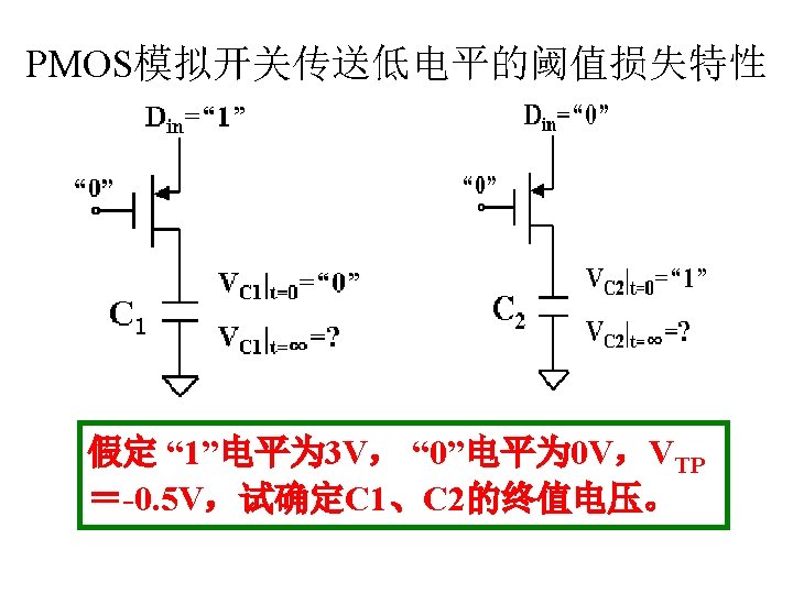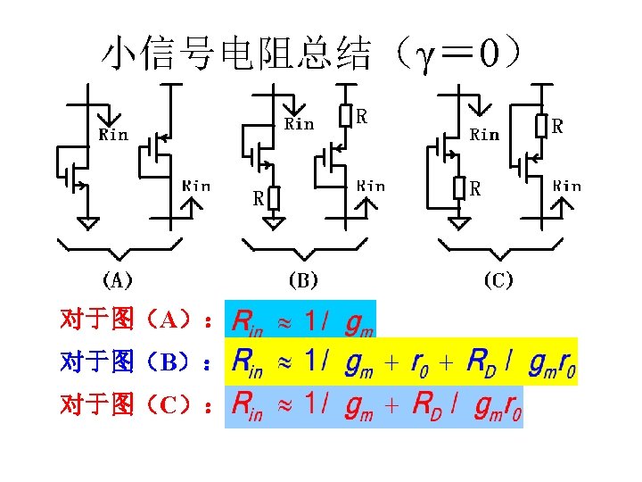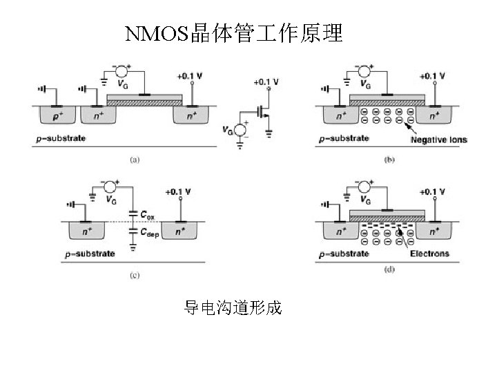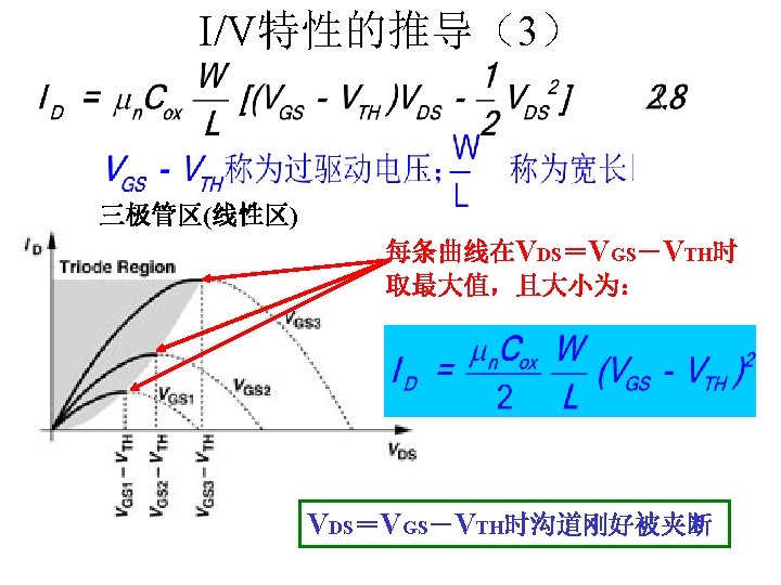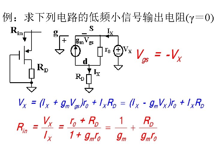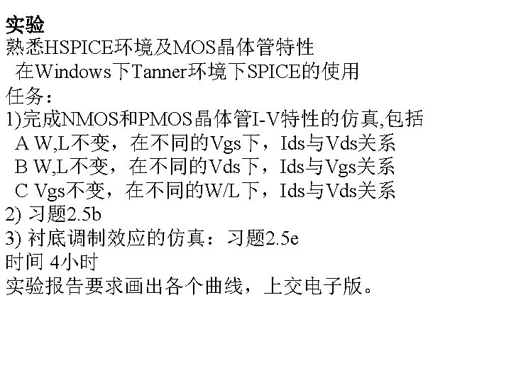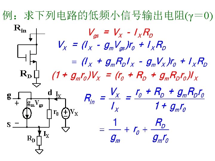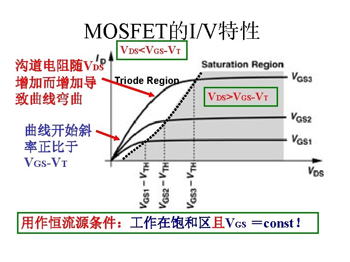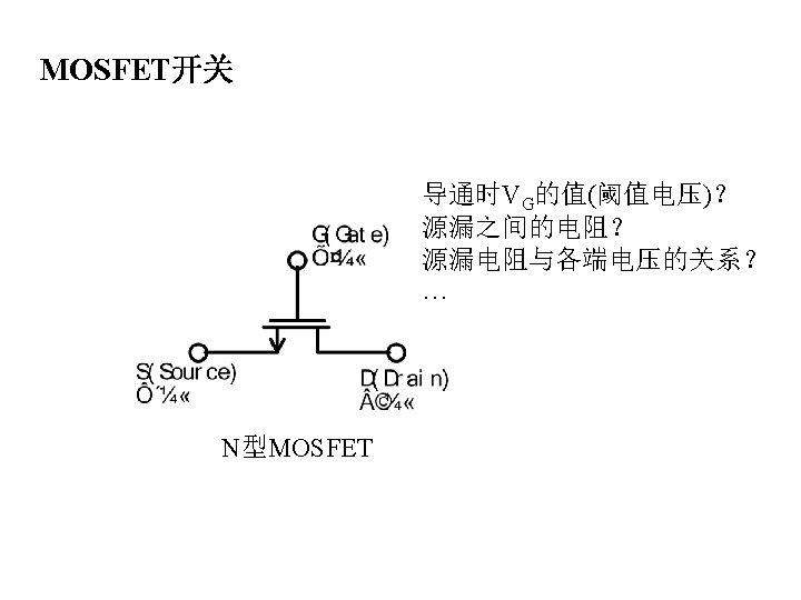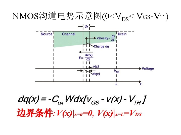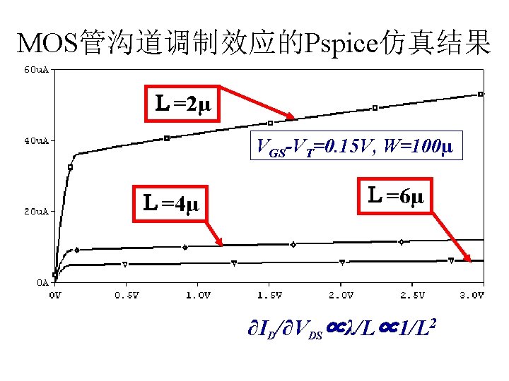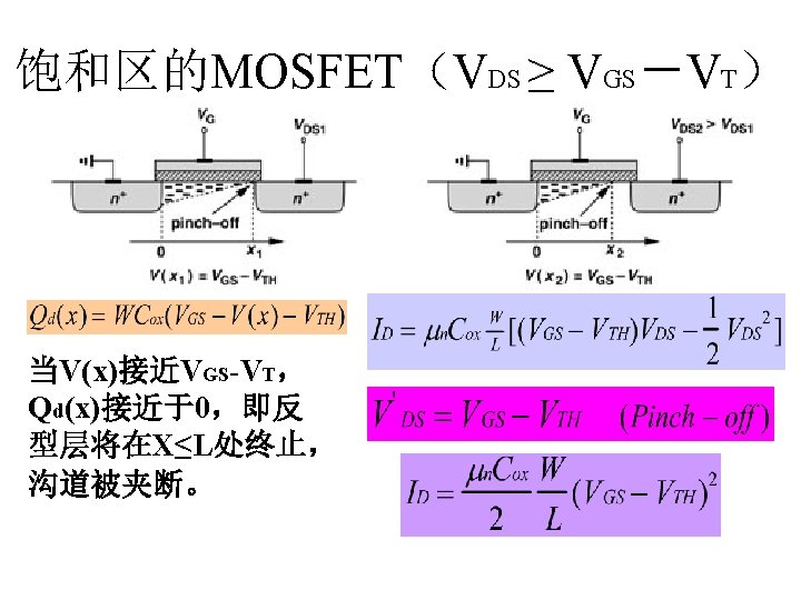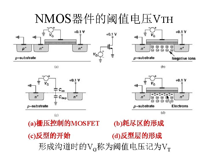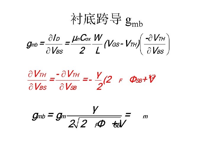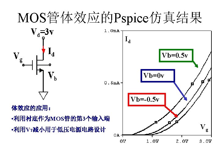 MOSFET MOSFET MetalOxide Semiconductor FieldEffect Transistor CMOS MOS Slides: 63 Download presentation MOSFET的结构 MOSFET : Metal-Oxide Semiconductor Field-Effect Transistor CMOS : 互补MOS n型MOSFET :载流子为电子 p型MOSFET :载流子为空穴 阱: 局部 衬底 VGS>VT、VDS=0 VGS>VT、VDS>VGS-VT称为饱和区 NMOS管的电流公式 截至区,Vgs<VTH 线性区, Vgs >VTH VDS< Vgs - VTH 饱和区, Vgs >VTH VDS >Vgs - VTH MOSFET的跨导gm 2) VGS > VTH VDS <<VGS – VTH深三极管区 3) VGS > VTH VDS >VGS – VTH饱和区 减小MOS器件电容的版图结构 对于图a: CDB=CSB = WECj + 2(W+E)Cjsw 对于图b: CDB=(W/2)ECj+2((W/2)+E)Cjsw CSB=2((W/2)ECj+2((W/2)+E)Cjsw = WECj +2(W+2 E)Cjsw 例:若W/L= 50/0. 5,|ID|= 500 u. A,分别求: NMOS、 PMOS的跨导及输出阻抗以及本征增益gmr 0 ( tox=9 e-9 λn=0. 1, λp=0. 2 , μ n= 350 cm 2/V/s, μ p= 100 cm 2/V/s ) tox=50 Å, Cox 6. 9 f. F/μm 2(1 Å=10 -10 m, 1 f. F= 10 -15 F) ∴tox=90 Å, Cox 6. 9*50/90=3. 83 f. F/μm 2 同理可求得PMOS的参数如下:gm. P 1. 96 m. A/V , r 0 P 10 KΩ ,gm. P r 0 P 19. 6