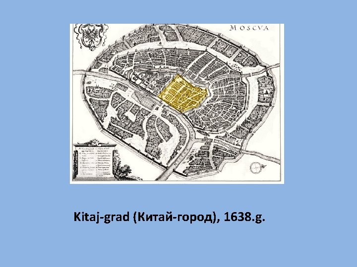 RAST I RAZVOJ MOSKVE - Moskva je grad koji se gradio stoljećima - u početku, bila je omeđena Kremljovskim zidinama, unutar kojih su se nalazile kneževske zgrade i druge građevine od državnog značaja, crkve i druge, stambene građevine - od 15. st. je Kremlj postao rezidencijom ruskih vladara - početkom 16. st. predstavljao je snažno utvrđenje s visokim kamenim zidinama i kulama u centru grada, o kojem se govorilo daleko van ruskih granica - grad se potom širio van granica Kremlja: izgrađen je Kitaj-grad (Китайгород), gdje su izgrađene razne institucije (Monetni dvor, Tiskarski dvor, Veleposlanički dvor, Zemaljski dvor - Монетный двор, Печатный двор, Посольский двор и Земский двор), carina, manastiri, itd. - taj dio grada su naselili boljari, bogati trgovci i svećenstvo - potom je izgrađen Bijeli grad (Белый город), a potom i Zemljani grad (Земляной город); taj posljednji nalazio se s druge obale rijeke Moskve