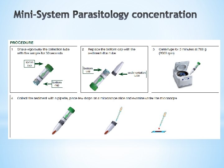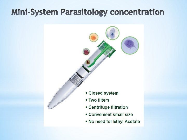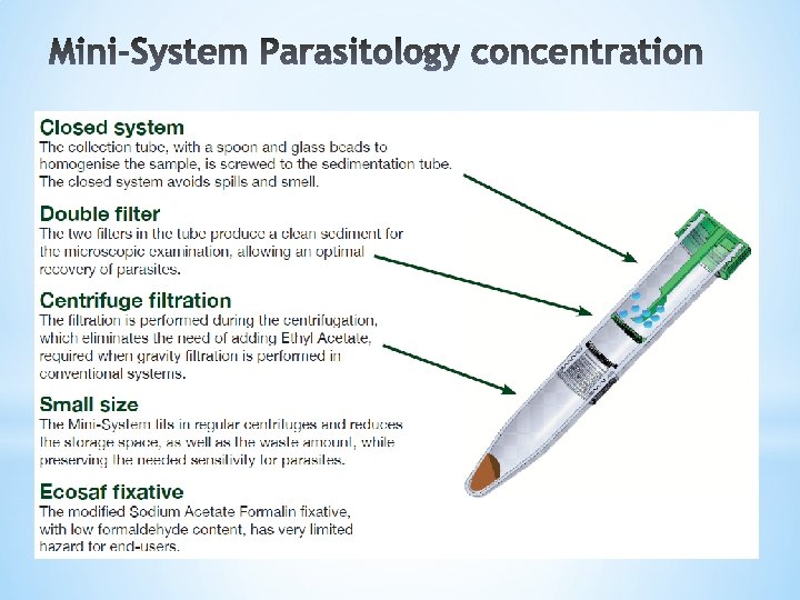 *1. A unique disposable system for parasitology concentration * Closed system * No need for Ethyl Acetate *2. A new Formalin free fixative * Same fixation properties as Formalin based fixative * Not dangerous * Minimal workplace safety requirements * No need for exhaust hoods * No special restrictions for transportation and disposal *1+2 = Unique features useful for tenders: * “Closed system with safe fixative for parasite concentration, no Ethyl Acetate is needed”