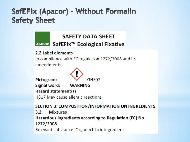 *ECOSAF * Sodium Acetate Formalin fixative * Low formaldehyde content: 0, 58% w/v. *PARAGREEN * Proprietary formulation: does not contain Formaldehyde, Alcohol or Heavy metals